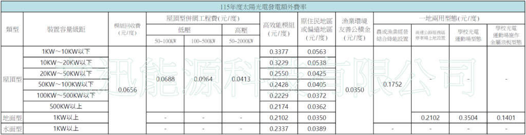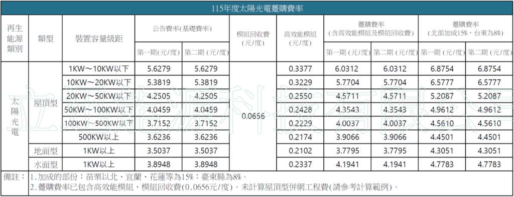 115年(2026)太陽光電躉購費率躉購費率 115年(2026)太陽光電躉購費率(115/02/05更新) 參考來源:https://www.moea.gov.tw/Mns/populace/news/News.aspx?kind=1&menu_id=40&news_id=121540